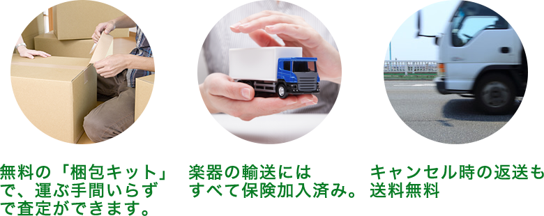 管弦屋の宅配買取は、簡単!楽に!楽器をお売りすることができます。 お電話または事前査定よりご依頼を頂き「梱包キット」を無料でお届けいたします。 あとはキットに楽器を入れて頂き、集荷を呼んでいただくだけです。 運送保険に入っておりますので、安心して送ることが可能です。 もちろん査定にご納得頂けなかった場合の返送は無料にて即日ご返送いたします。